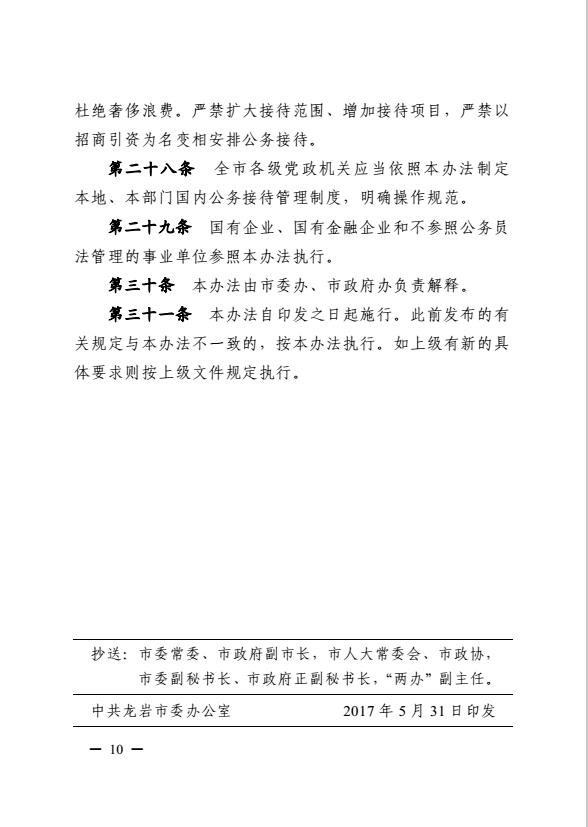 市委辦、市政府辦關于印發《龍巖市黨政機關國內公務接待管理暫行辦法》的通知(巖委辦發【2017】20號)
